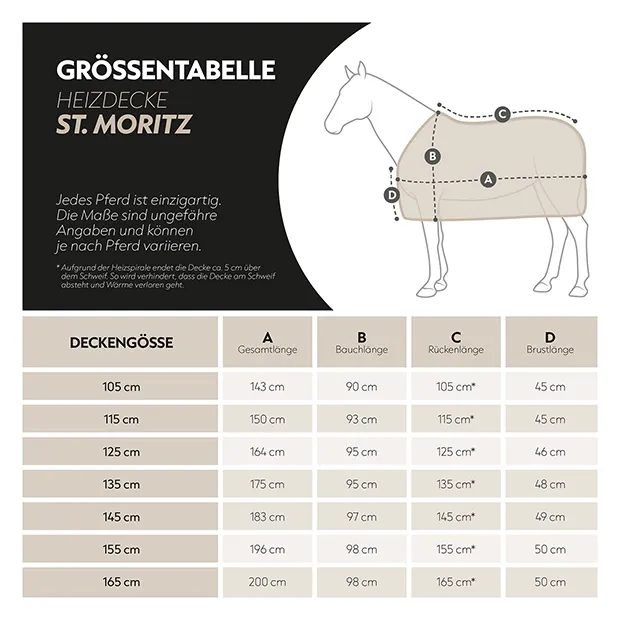 Unsere Heizdecke “St. Moritz” vereint modernste Ingenieurstechnik mit praxisnaher Anwendung im Pferdesport. Entwickelt in Zusammenarbeit mit einem führenden Technologiepartner für innovative Wärmekonzepte in der Automobilindustrie, erfüllt sie höchste technische Standards in Sicherheit, Funktion und Zuverlässigkeit. Sie unterstützt den Bewegungsapparat durch gezielte Wärmeeinwirkung, fördert die Durchblutung, löst Verspannungen und trägt so zu mehr Beweglichkeit, Regeneration und Wohlbefinden bei. Über mehrere Heizstufen – von sanfter Grundwärme bis hin zu intensiver Tiefenwirkung sowie einem automatischen Programm – lässt sich die Intensität flexibel an Training, Alltag oder Rehabilitation anpassen. Dank isolierter Rückenpartie bleibt die erzeugte Wärme gleichmäßig erhalten, während atmungsaktive Materialien wie Wolle für ein trockenes, komfortables Tragegefühl sorgen. Ob vor dem Reiten, beim Longieren, während des Transports oder als Reha-Begleiter: Die Decke ist vielseitig einsetzbar und bietet in jeder Situation eine zuverlässige Unterstützung.
